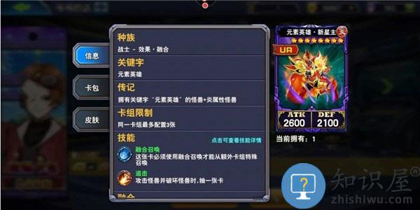 一技能:一回合一次,入场后,从卡组把一张〈融合加入手牌〉(融合是元素英雄卡组不可或缺的核心卡,有这张卡融合上手率太太提升)