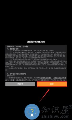 1、阅读适龄提示和隐私政策后,点击红框标注的橙色同意按钮。