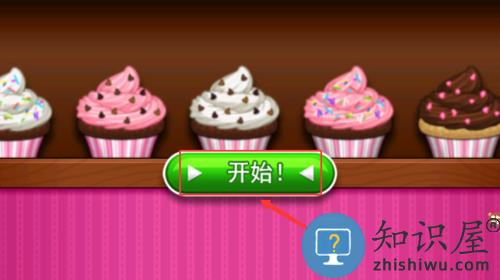 1、点击红框箭头指向的绿色开始按钮,启动蛋糕制作游戏。