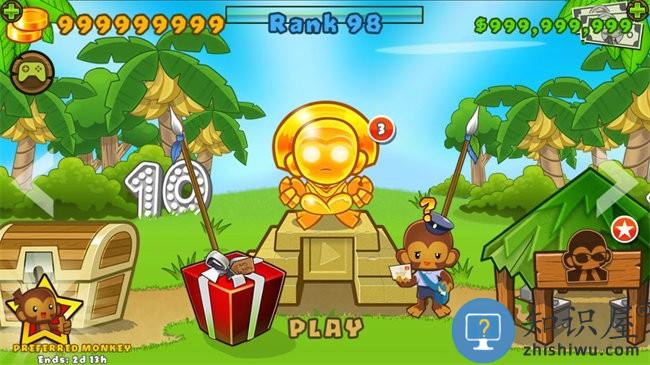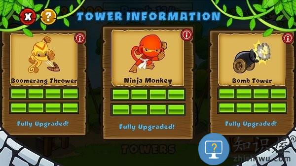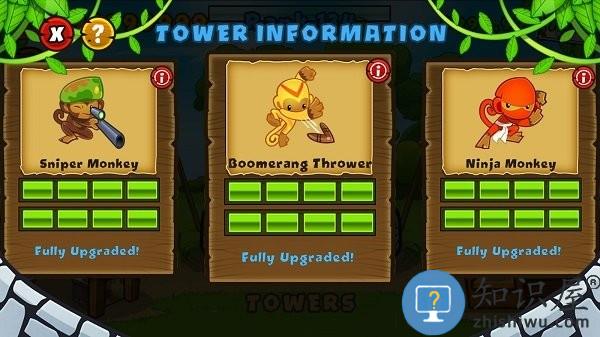 狙击手猴全屏幕射程,射速慢,初始每枪穿透两层气球,建议点击后选择“strong”攻击模式。