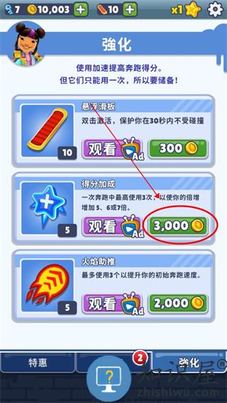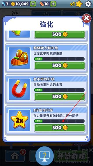 点击商店里的强化,购买“得分加成”后在游戏中使用,可在短时间内提升倍数。