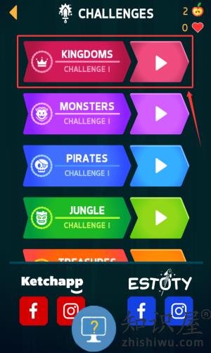 2、选择红框箭头指向的王国挑战,点击播放按钮开始。