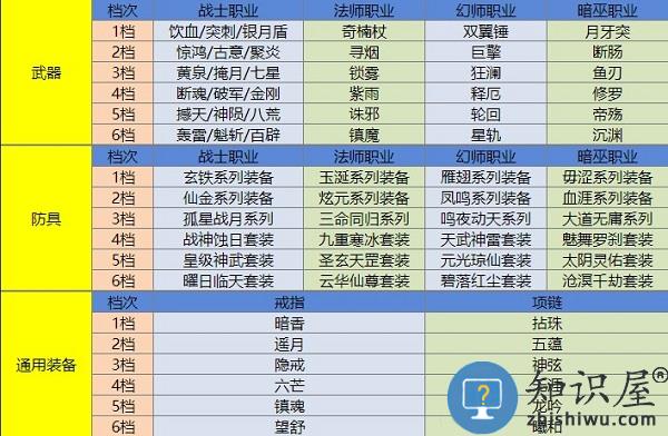 不同档次的装备代表不同的品质,由低到高分为:1档、2档、3档、4档、5档、6档共6种档次,越后面的档次,属性值越高。