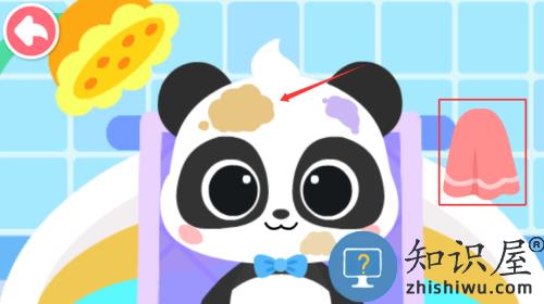 2、根据红框箭头提示,用毛巾帮熊猫擦脸。