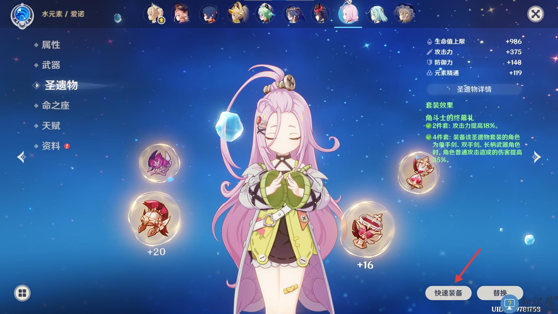 3、圣遗物首选纺月的夜歌4件套,主词条推荐精通沙、精通杯、精通/暴击头。