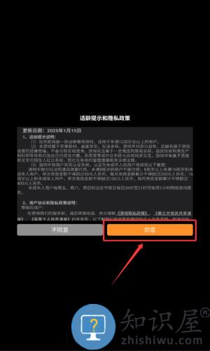 1、阅读适龄提示和隐私政策后,点击红框标注的橙色同意按钮。