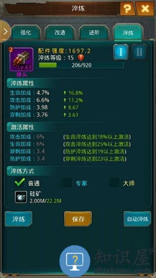 2、下面说重点淬炼技巧,上图是根据发帖需要,随便炼的,很多玩家一味用硅淬炼,发现半天属性不见长,这是为什么呢?其实这是有技巧的,配件淬炼十级以后,就要注意每升两级都要观察下。如果觉得属性没有增长,那就洗掉重新淬炼。初始属性只有满属性的1/3左右的样子,这样你再好好淬炼,必定会出更好的属性。如果有专家或者大师淬炼证、金币淬炼,那效果还会更好。(ps.好多玩家,都想穿防30满,在已经淬炼到穿防20的前提下,再用专家或者大师淬炼证、金币淬炼却怎么也不升,这就是没掌握洗掉重炼的技巧。而在众多配件属性中,穿防是最重要的,其次才到攻击生命。)