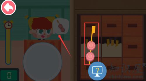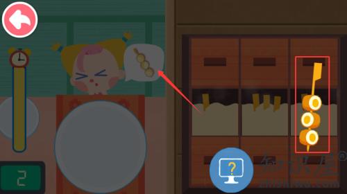 2、根据红框提示,从橱柜取出肉串交给小女孩。