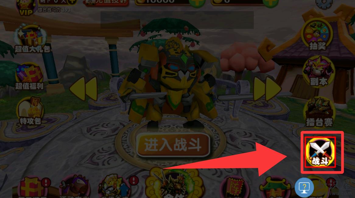 3、进入游戏界面点击红色框框里的战斗。