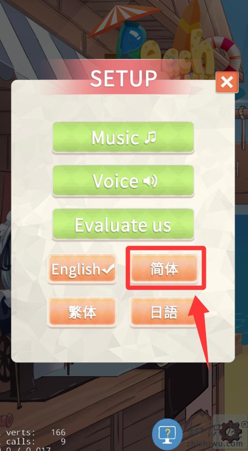 1、进入游戏点击红色框框里的简体。