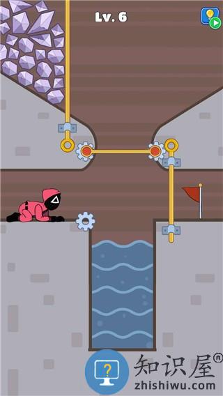 3、第六关利用落石堵住水池,创造新的通行路线完成逃脱。