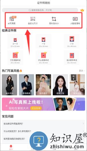 3、选择AI写真照或自定义尺寸等功能,制作证件照。