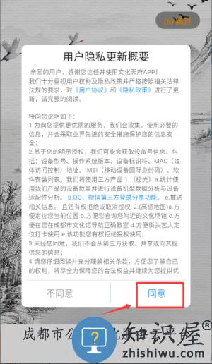 1、启动文化天府应用,先在隐私更新页面点击同意按钮继续操作。