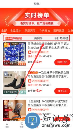 2、切换至榜单页面中,选择2小时热销榜、高佣榜等浏览热门推广商品。