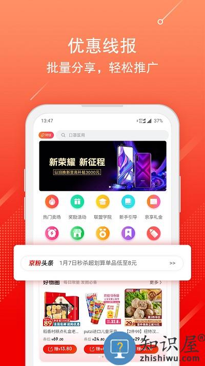 京享街是京东旗下的分销推广App,只需你注册成为推广者,挑选喜爱商品,分享推广,引导人群购买,交易成功后推广者便可获得相应的佣金。