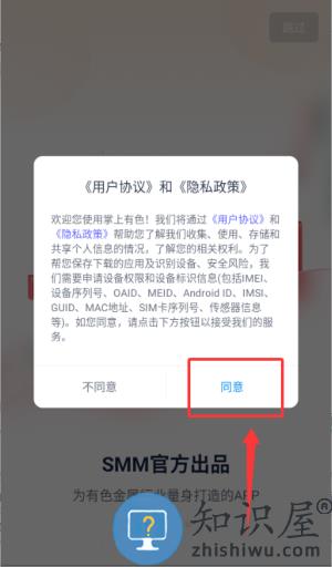 1、在掌上有色APP中点击"同意"用户协议,进入引导页面。