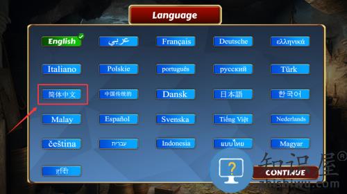 2、选择红框箭头指向的简体中文,点击CONTINUE按钮确认。