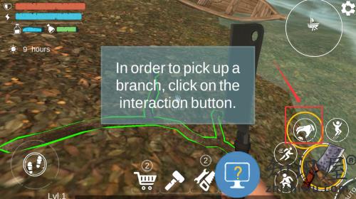 3、根据红框提示点击钩状交互按钮,拾取树枝。