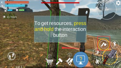 3、按住红框标注的互动按钮,持续按压来收集资源。