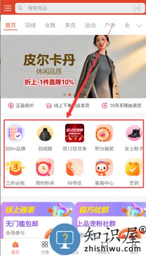 3、首页汇聚三百余个品牌,提供羽绒服专区和积分抽奖、限时抢购活动。