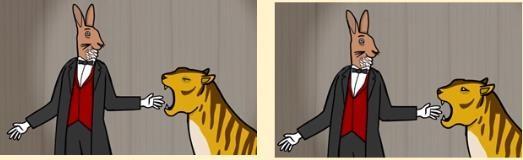 6、第六幕:只有当老虎闭上眼睛的时候,才可以按住兔子先生让他伸手臂。否则兔子先生的手臂会被老虎吃掉