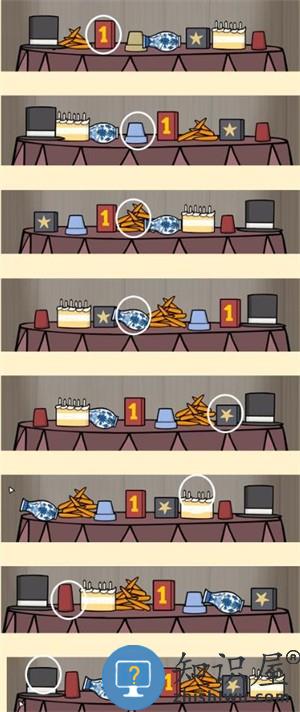 13、第十三幕:将正确的食物放入藏着不同动物的魔术帽中。动物从左到右分别是牛、狗、松鼠、猫、兔子、猴子。