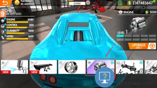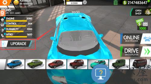 1、在主界面点击红框箭头指向的UPGRADE按钮,升级车辆引擎。