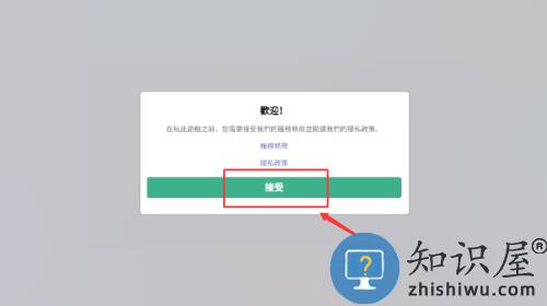 1、阅读欢迎界面后,点击红框箭头指向的绿色接受按钮。