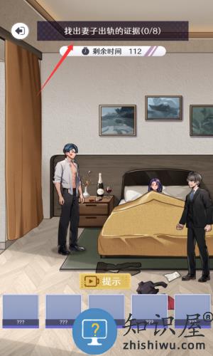 2、点击红框箭头指向的提示按钮,获取寻找线索的指引。
