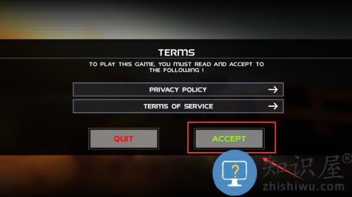 1、阅读游戏条款后,点击红框箭头指向的ACCEPT按钮,接受条款继续游戏。