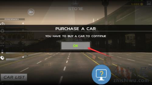 2、点击红框箭头指向的OK按钮,确认购买一辆汽车才能继续游戏。