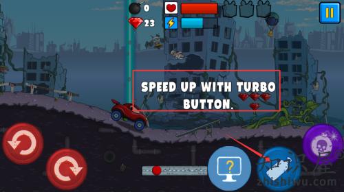 3、使用红框箭头指向的涡轮按钮,为车辆加速冲刺。