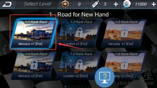 3、选择红框箭头指向的1-1关卡,在摩纳哥比赛。