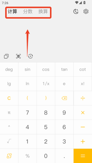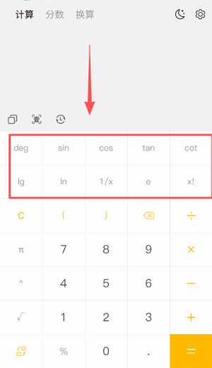2、需要复杂计算时左滑或点击菜单选择科学计算器模式可以使用三角函数对数幂运算等高级功能。