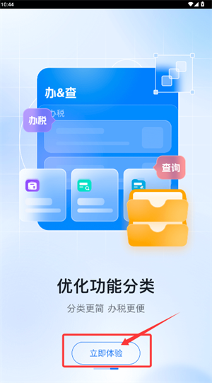 1、在功能引导页面中,轻点"立即体验"按钮,即可进入办税主操作界面。
