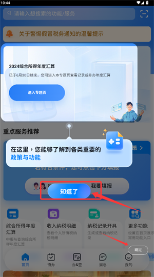 安装个人所得税软件,打开软件后,先进行注册登录,进入年度汇算:首页【常用业务】—【综合所得年度汇算】