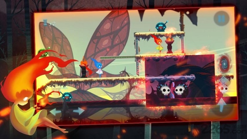 1、控制角色在清新梦幻的双世界地图中跳跃穿梭躲避机关陷阱。