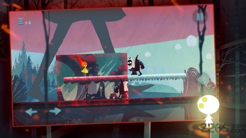 当然游戏不会这么简单,这是因为火炬并不只存在于表面,所以主角得使用她那回溯过去的能力,将在过去时间中所存在的火炬也点亮了,才能真正地完成一关。然而关于过去地点的显示只有屏幕中的一小格,玩家需要拖动这个小格子才能够完好地看到不同于现在的关卡设计。
