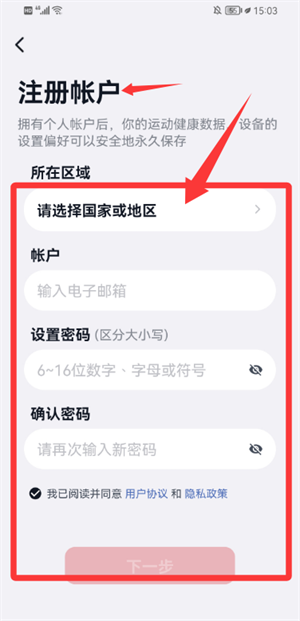 2、在注册界面选定地区,填写邮箱并设定密码继续下一步。