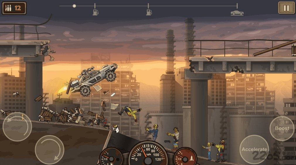 1、操控战车在横版关卡中前进,利用速度撞击或车载机枪消灭沿途的僵尸。