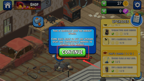 1、点击CONTINUE按钮,查看并升级你的藏身处。