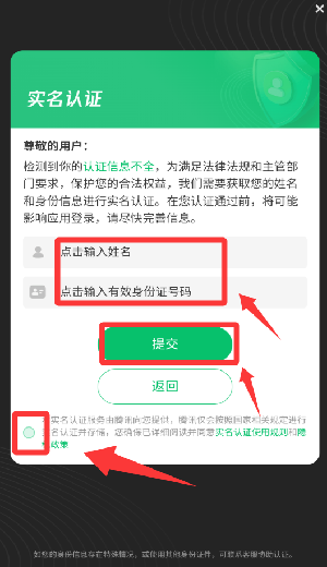 3、输入真实姓名和身份证号码并打√然后提交。