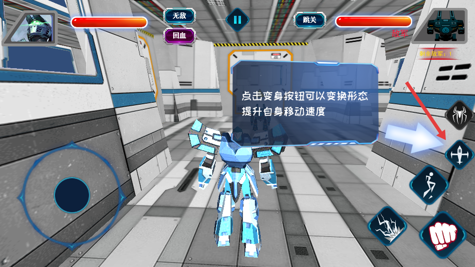 2、点击攻击与技能按钮进行战斗并可点击变身切换形态。