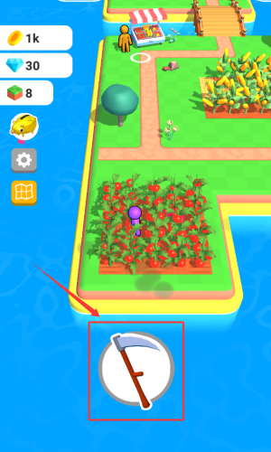 1、点击镰刀图标,用工具收割红色作物。
