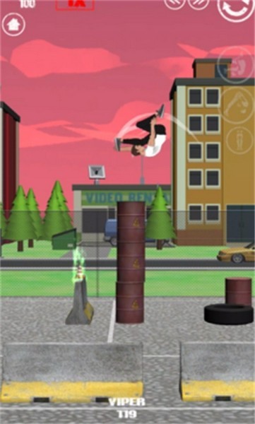 1、玩家在街头风格场景中操控角色跑酷,目标是完成特定特技组合并精准落地以累积分数,关卡推进后障碍更复杂,要求更高。