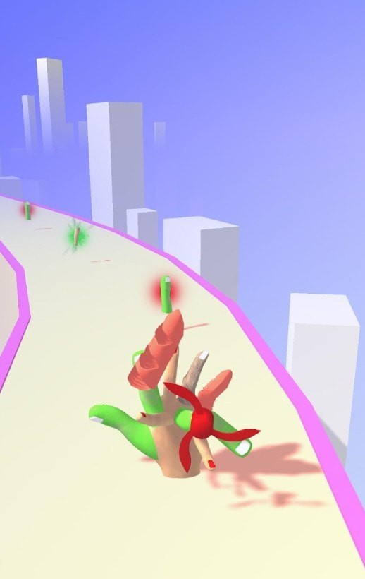 2、左右滑动屏幕控制手掌的移动方向,收集手指,躲避障碍物和陷阱;