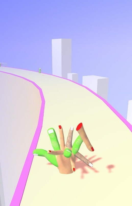 跑酷的主角是手掌,可以收集沿途的各种手指头,有怪兽的绿手指、有涂抹了指甲油的手指,还有长满了汗毛的手指,