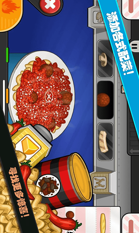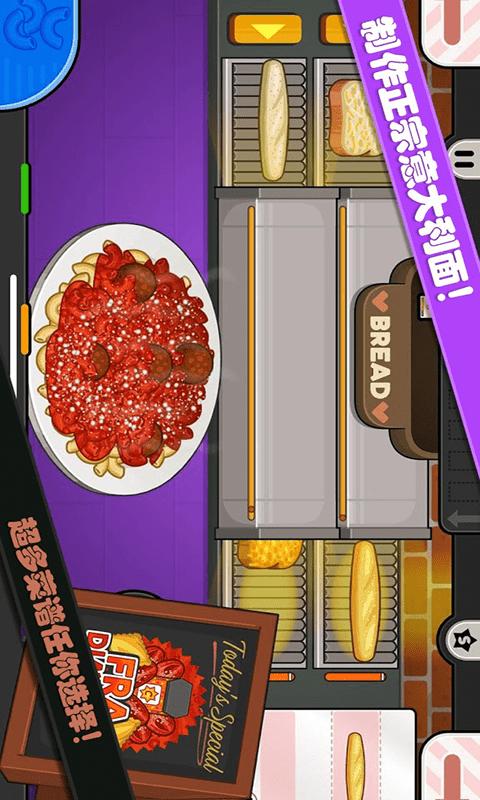 欢迎来到《老爹小镇意大利面店》这是你在老爹小镇新开的一家意大利面店,每天都有大量的客人进来消费,你必须点餐,煮面条,搅拌面条,然后倒入美味的酱汁,才能做成一盘完美的意大利面!在每一份意大利面上加入摇瓶和配料,然后用一份新鲜烤面包来完成这顿饭。在假期中,为饥饿的顾客提供季节性的美食!