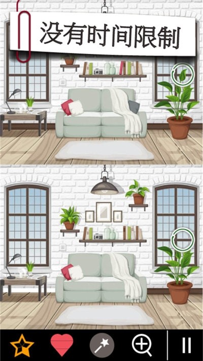这是一款拥有高清晰画质,休闲娱乐打发时间的益智小游戏;游戏让你在两张有许多不同的小细节,让你在规定的时间找到他们的不同,既能娱乐休闲用还能考验你的观察能力和细心程度。