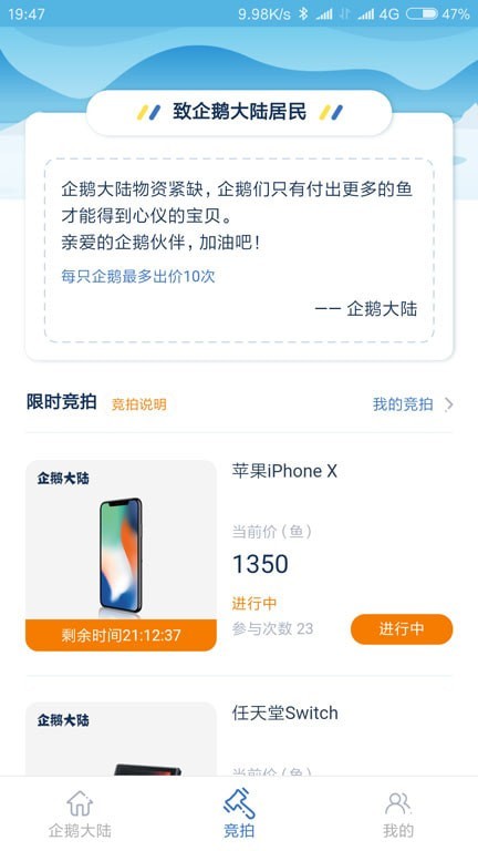 企鹅大陆中的鱼为企鹅大陆对用户的参与奖励,并可用于竞拍丰厚的礼品;